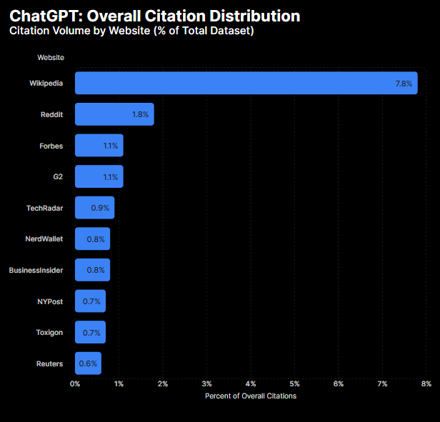 - ChatGPT se base à 47,9 % sur Wikipédia, suivi de Reddit, Forbes, G2, Reuters.